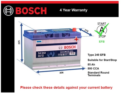 - EFB Car Battery S4E42 Bosch 249 EFB 800A 85Ah 4Yr WTY 306x173x225 Start Stop (For: Mitsubishi Outlander)Free tracked delivery. Next working day UK despatch.Brand new