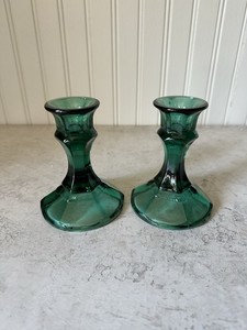 Vintage Indiana Glass Hexagon Green Candle Stick Holders Set of 2