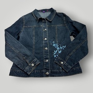 Jeanbay Women’s Denim Jacket Size L Dark Blue X Blue Floral Embroidery Button Up