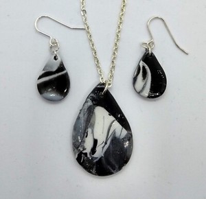 Ooak handmade polymer clay teardrop pendant earring set in monochrome black, sil