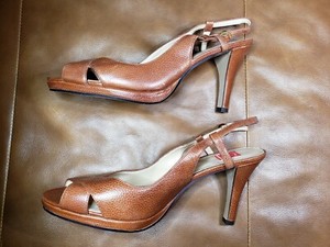 Oscar Oscar de la Renta Slingback Heels Peeptoe Leather Size 9M Tobacco Brown