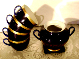 Lomonosov Cobalt Blue & Gold Vintage Porcelain 4 Cups, 1 Sugar Bowl Made in USSR