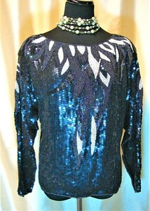 EUC Dominique S 100% Silk Fully Beaded Black Iridescent Occasion Vintage Blouse