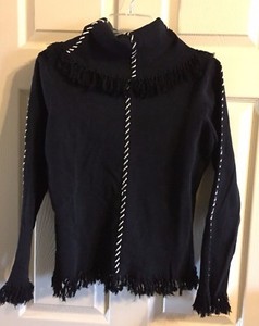 Vtg SHARON YOUNG BLACK SWEATER TOP WHITE SUEDE WHIPSTITCH & FRINGE ACCENTS; MED