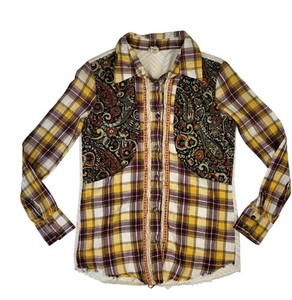 BKE Gimmicks Buckle Mustard Yellow Purple Colorful Plaid Mixed Media Button Top