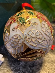 Vtg. Victorian Enamelling Cloisonne Ornament Pair of Doves Holly Berries & Roses
