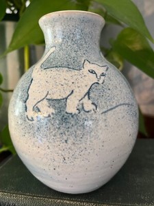 Vintage Art Pottery Bud Flower Plant Clippings Vase Kitty Cat Signed Mary S.