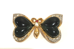 VINTAGE D'ORLAN GREEN GLASS JADE & RHINESTONE PAVE GOLD BUTTERFLY PIN BROOCH
