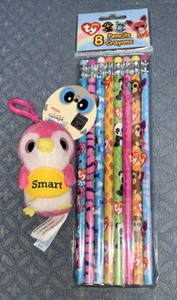 JUSTICE & BEANIE BOOS ty BACK TO SCHOOL PENCILS & PINK PENGUIN SMART BAG CHARM!!