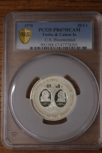 1976 TURKS CAICOS IS 20 crowns BICENTENNIAL PCGS PROOF PR67 DCAM RARE (4) SILVER