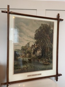 Vintage Large Cottage Oil Print Framed Retro FISHERMAN'S REST Mid Century 25"