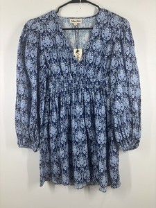 NWT Celina Moon 100% Cotton Blue Patterned V Neck Puff Sleeve Smocked Dress S
