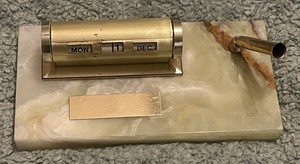 Vintage Scottco MCM Desk Perpetual Calendar & Pen Holder Gold Brass Metal Onyx