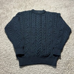 Vintage Pure New Wool Green Blue Cableknit Sweater Medium Adult 1980s Fisherman