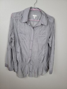 Chicos Womens Sheer Button Front Shirt Sz 2 Gray Roll Tab Sleeve Pockets A16
