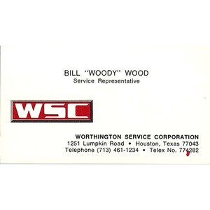 Worthington Service Corporation Bill Woody Wood Houston TX Business Card SB4-B9
