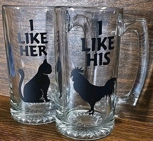 "I Like Her" Cat "I Like His" Rooster Pair Of Thick Glass Beer Mugs Glasses