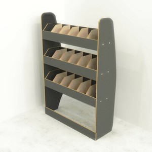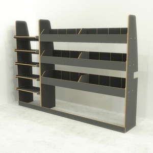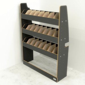 CNC machined, modular van racks. Manufactured from quality hardwood plywood and constructed using traditional Mortise & Tenon and Dado joints for strength & longevity. Shelf units have removable slide in divider sections to adjust compartment widths, as well as adjustable heights via indexed mounting holes. Unique features not to be found in other Plywood racking modular systems.