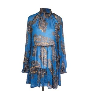 Free People Sz M Pullover Damask Print Chiffon High Neck Dress Long Sleeve Blue.