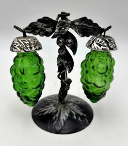 MCM Vintage 1960s Green Glass Hanging Grape Salt & Pepper Shakers w/ Metal Stand