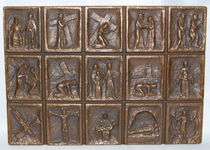 XL relief, Way of the Cross, artist Hüwel, bronze, bronze relief, 15 stations, church