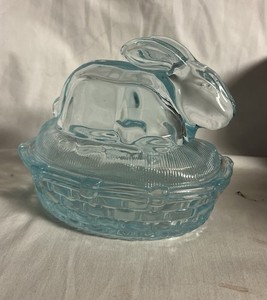 Vintage Ice Blue Bunny on Nest Trinket/Candy Dish Unmarked GLOWS