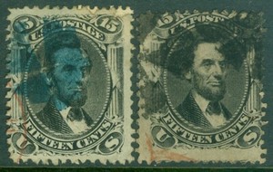 EDW1949SELL : USA 1866 Sc #77. 2 stamps Used 1 Red cancel 1 Blue cancel Cat $415
