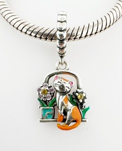 Cat Flowers Dangle Charm Animal Pet Floral Genuine 925 Sterling Silver 💖