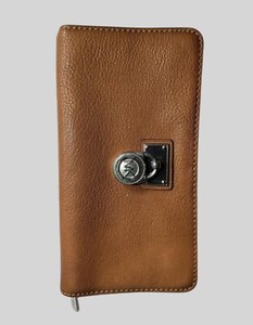 MICHAEL KORS Full Zip Brown Tan Leather Hamilton Wallet Silver Hardware