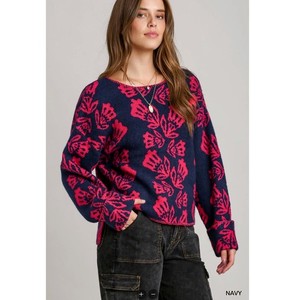 Umgee Womens Pull Over Floral Jacquard Sweater Navy Blue Pink Size Small