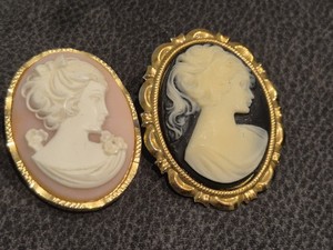 Cameo Brooch X2 Nice Size Large pink Stamped C206 and black unstamped VGC