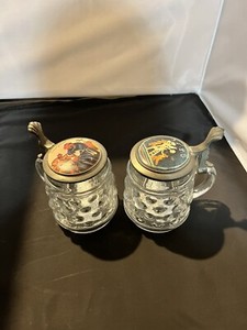 TWO ORIG BMF SCHNAPSKRUGERL REIN ZINN HOBNAIL GLASS PEWTER LID STEINS W GERMANY