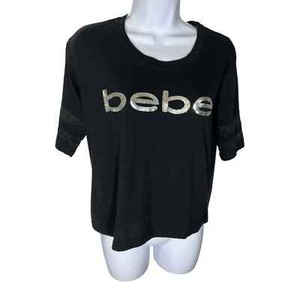 Bebe Sport Black Short Sleeve Mesh Trim Embellished Logo Top Women's Size Small