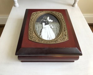 Vintage Wooden Jewelry Box with Hinged Lid Photo Insert Velvet Lined 9.5 x 8 x 3