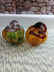 2-Hand Blown Cracked Glass Pumpkin Light/dark Amber Coiled Applied Stem 4.5” T