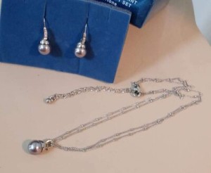 New Avon Jewelry Set Silver Double Chain Necklace Gray Pearlesque Bead Earrings