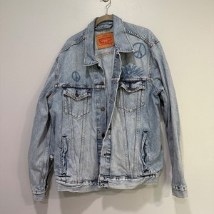 Levi's Denim Trucker Jacket XL Blue Peace Sign Bleach Wash Distressed