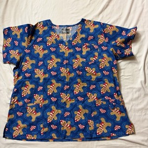 Butter Soft Women’s Scrub Top Gingerbread People On Blue Background Christmas 2x