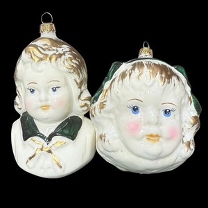 Pair Vtg Style Glass Girl Cherub Face Ornaments Figural Hand Painted Germany