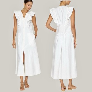 NEW Brochu Walker The Aurora Ruffle Midi Dress Pockets Cotton White Women Size L