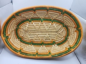11"x7.5" Woven Sea Grass Oval Basket, Beige Green Orange UNIQUE Pattern Beauty!