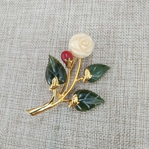 Vintage Gold Tone 2" Pin Flower Brooch Coral Rose Jade Leaves Red Bud