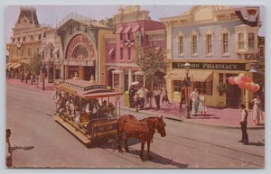 Chrome Postcard Disneyland California Upjohn Drug Store and Horse Carriage