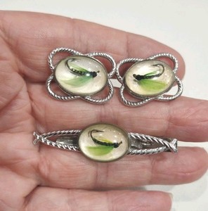 Vintage Anson ST Fly Fishing Cabochon Tie Clip, Cuff Links Set, 2", 1", A90