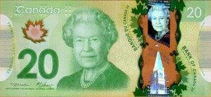20 Dollars bank bill. Canada 2012 series. $20 Banknote. single Polymer QEII UNC.