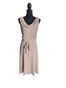 R&K Originals Women's Beige with White Polka Dots Chiffon Belted Dress Size 14