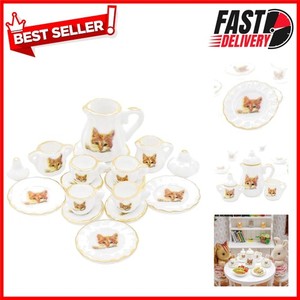 Elegant 1/12 Scale Miniature Tea Set - 15 Piece Cat-Themed Dollhouse Accessories