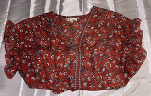 MAX STUDIO Size Large Top Blouse Scarlet Red Floral Ruffled Sleeve Tie Waist