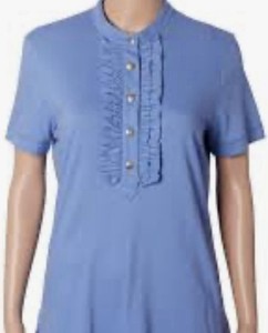 Tory Burch Lidia Ruffle Polo Shirt Women's Blue 1/4 Button Up Short Sleeve Sz M