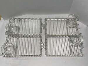 4 Sets Hazel Atlas Snack Sip Smoke Ball & Ribbed Glass Plate Tray w/Round Cups